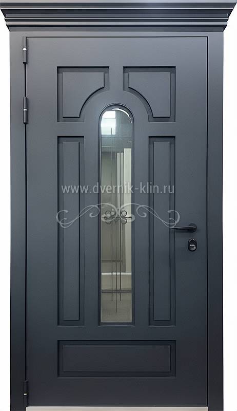 Металлофиленчатая входная термодверь с карнизом, ковкой, остеклением и порошковой покраской антрацит создана для тех, кто ценит надёжность, комфорт и эстетическую выразительность. За счёт соблюдения производственных стандартов дверь подходит для установки как внутри помещений, так и на фасадах зданий.